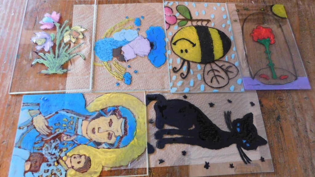 Są to warsztaty plastyczne, podczas których uczestnicy poznają technikę malowania na szkle. Płytki szklane są w dwóch rozmiarach mniejsze i większe. Najpierw tworzy się kontury czarnym mazakiem, a następnie pola wypełniane są farbą akrylową. Prace uczstnicy zabierają ze sobą.