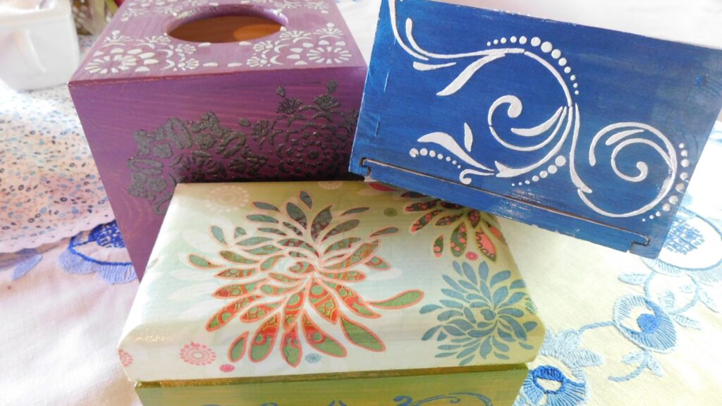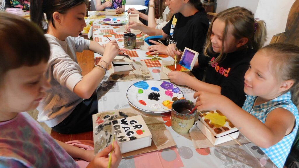 Uczstnicy warsztatów malują dreniane niewielkie pudełka dowolną techniką.